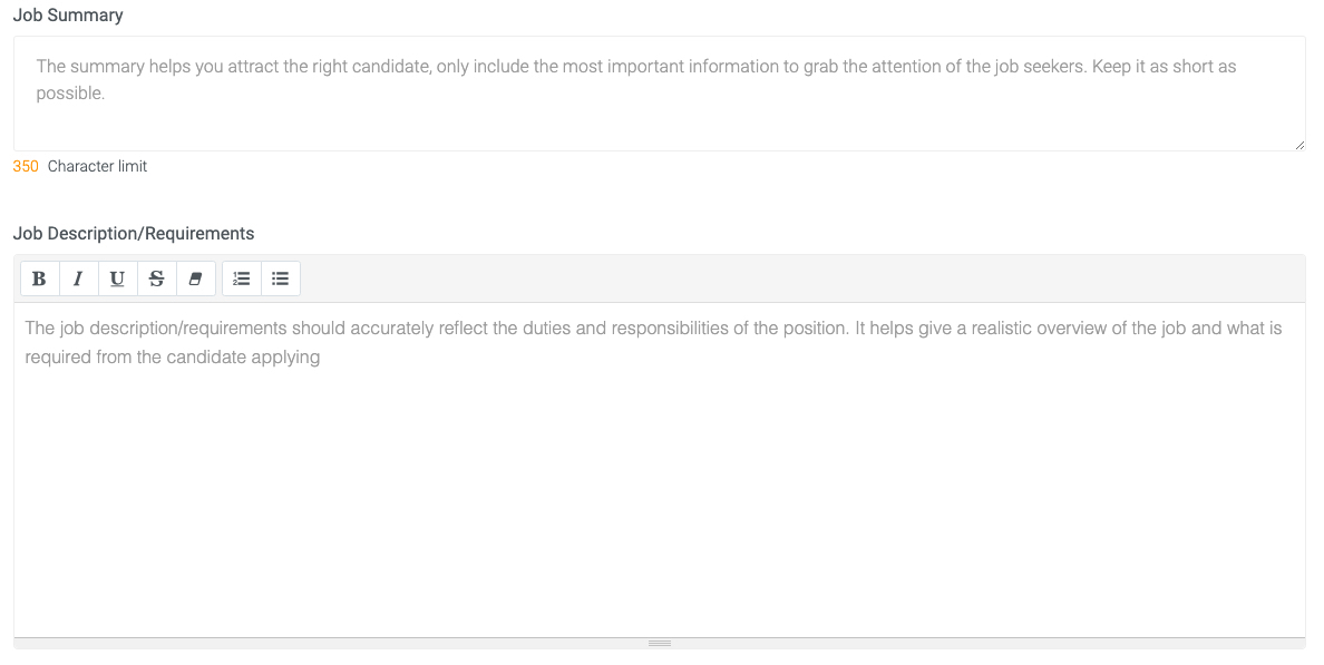 To make it easier to know what to include in the Job Summary and Job Description sections, the BrighterMonday Applicant Tracking System has recently included helper text to guide you on the what content needs to be added as seen in the image below: